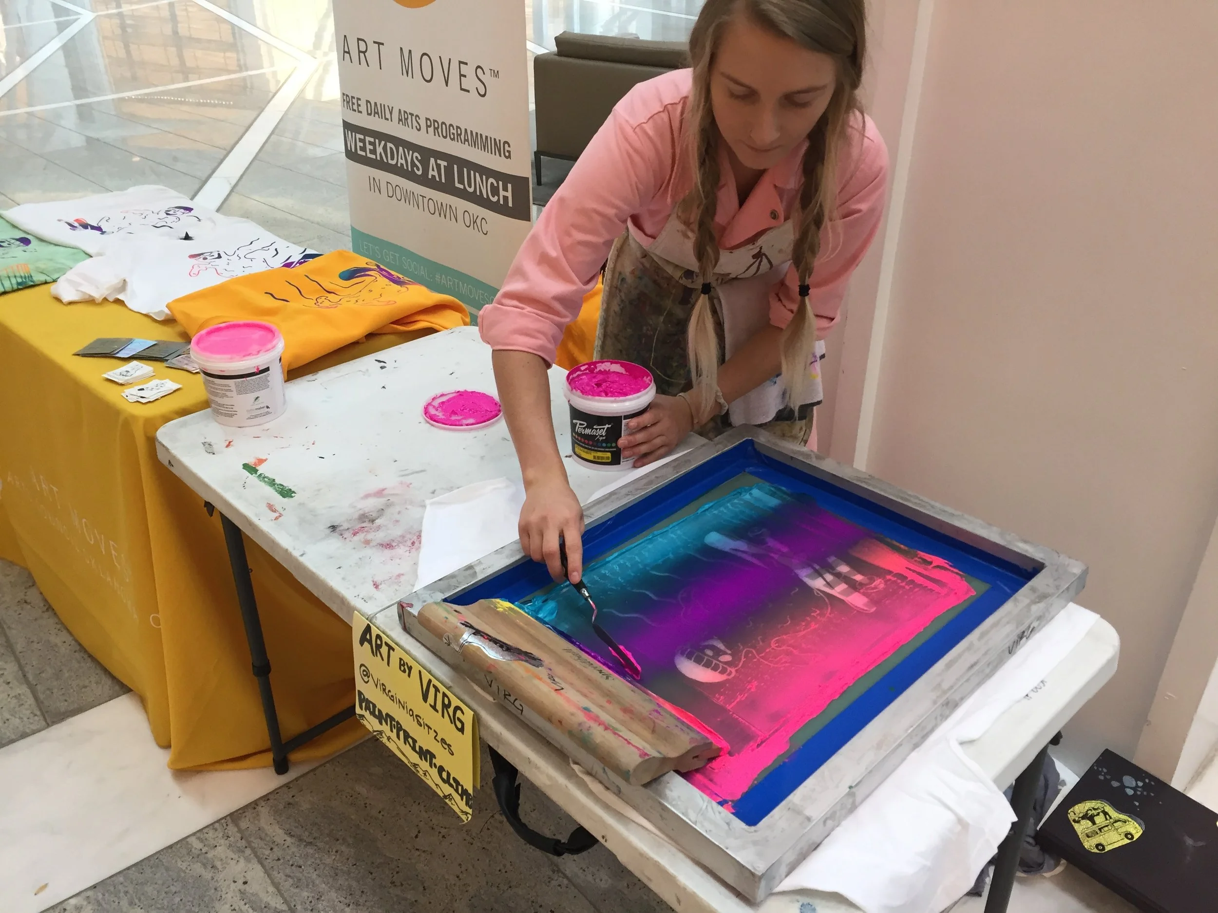 Press member Virginia Sitzes is well-versed in the art of screen printing and makes all kinds of cool clothes with her unique designs! Learn the basics from creating your own design to burning a screen to produce t-shirts in the Artspace studio. Please bring your own t-shirts to print on, Artspace will provide paper for printing in addition to all of your other supplies such as ink and screens.